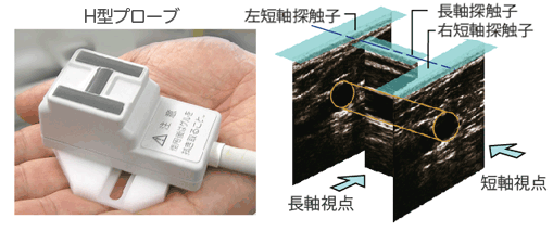 特徴1:長軸画像と短軸画像が同時に描出できるH型プローブ