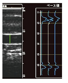 血管径計測は、Bモード画像の5倍の分解能を持つAモード波形による計測を採用することにより 検者間誤差を少なくし、高い再現性を実現しています。