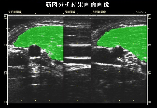 ユネクスイーエフはFMDの値と共に、上腕二頭筋の筋肉量と筋質(霜降り度)が算出可能です。